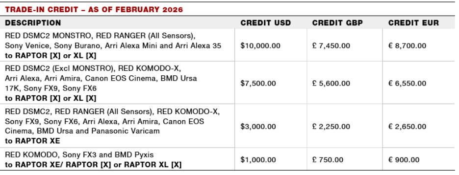 - The promotion is open to owners of RED and third-party cameras and provides trade-in credit when purchasing a new V-RAPTOR XE, V-RAPTOR [X], or V-RAPTOR XL [X] camera(alone or in a bundle).