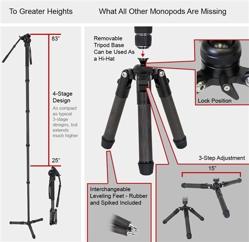 The 4-stage carbon fiber construction collapses to a compact size for transport and extends to over 6.5 feet while maintaining excellent rigidity. High-quality twist-lock fittings ensure fast, secure height adjustments during on-the-go shooting. The folding tripod base locks into three positions for flexible operation and can be removed entirely to use the system as a standard monopod. Adjustable rubber feet allow precise leveling, while included spiked feet provide extra grip on uneven or outdoor surfaces.