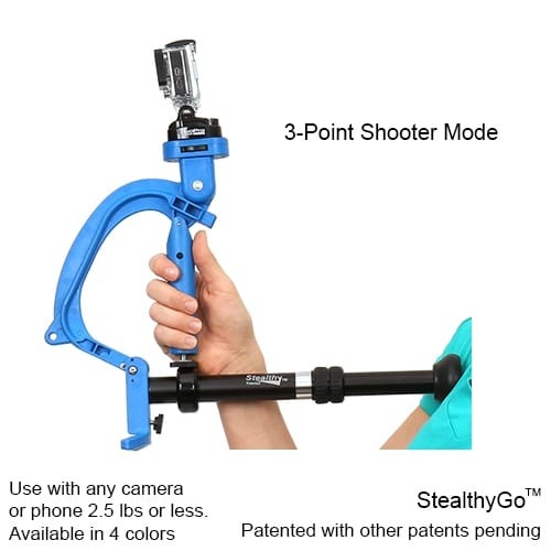Designed for GoPro® cameras, mobile devices, and small camcorders, the StealthyGo™ adapts to your shooting needs in seconds. Switch from handheld mode to a monopod, tripod, tabletop, or 3-point shooter setup for stable shots in tight spaces or extended handheld sessions. A built-in belt clip allows quick access in “hip mode” so you never miss a shot.