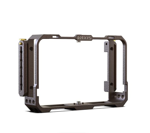 The Vaxis VAC23-02 Monitor Cage provides durable, lightweight protection for the Atom A5 SDI 5.5" wireless monitor, mounting securely via captive top and bottom screws while keeping all ports and buttons fully accessible, and features dual NATO side rails plus multiple mounting threads for attaching accessories such as the Vaxis sun hood or side handles.