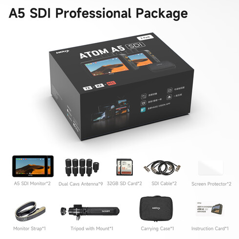 The Vaxis Atom A5 SDI Monitor Professional Package delivers a complete dual-monitor wireless video solution with two 5.5" 1920x1080 touchscreen TX/RX monitors, each offering 2000 cd/m² brightness, SDI/HDMI I/O with loop outputs, 1000' transmission range, MP4 recording to microSD, dual L500 battery plates, and CINE OS tools including 3D LUTs and scopes, bundled with nine antennas, two 32GB SD cards, two SDI cables, screen protectors, monitor strap, extendable tripod with mount, and a protective carry case.