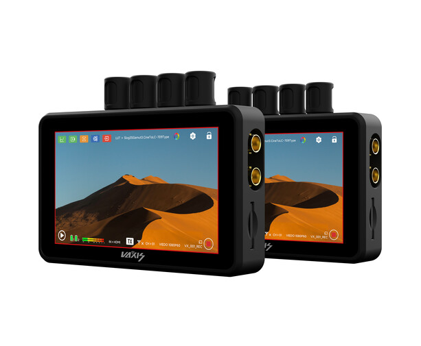 The Vaxis Atom A5 SDI Monitor Professional Package includes two compact Atom A5 SDI 5.5" wireless monitors, each functioning as both transmitter and receiver within the Vaxis Atom ecosystem for line-of-sight video transmission up to 1000'. Featuring a 1920x1080 touchscreen LCD with 2000 cd/m² brightness and 1200:1 contrast, the monitors support 1080p60 via SDI and HDMI inputs with loop-through outputs, built-in MP4 proxy recording to microSD, timecode sync with camera record trigger, and advanced CINE OS imaging tools (waveform, vectorscope, histogram, peaking, up to 50 3D LUTs). Each unit includes dual replaceable antennas, a fixed dual L-Series battery plate, and 1/4"-20 mounting. The package enhances usability with nine total antennas, two 32GB SD cards, two SDI cables, two screen protectors, a monitor strap, an extendable tripod with monitor mount, and a carry case for professional fieldwork.