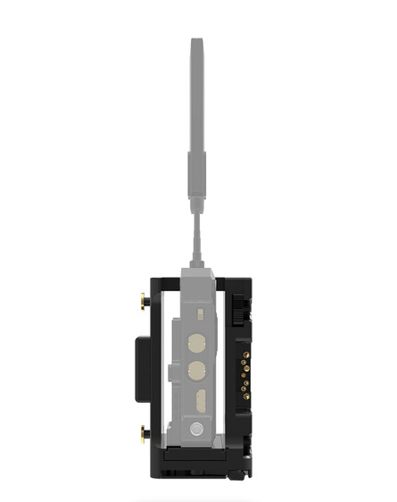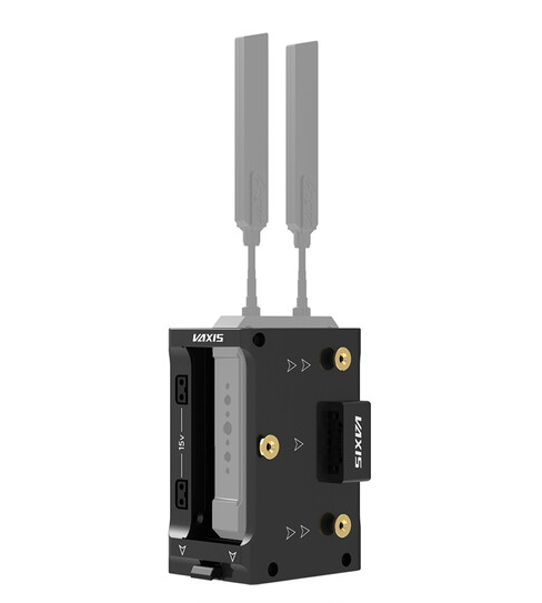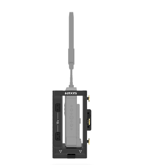 The Vaxis VS23-TX-AB Dual-Voltage Wireless TX Cradle is a robust power and mounting accessory designed to support professional wireless video transmitters, offering dual D-Tap outputs with compatibility for 14.4V and 28V input sources to ensure reliable operation across various battery systems. It includes a quick-release plate that securely accommodates Vaxis and Teradek transmitters as well as other transmission units, while its versatile mounting interface integrates seamlessly with Gold Mount battery plates, making it an essential component for rigged camera setups requiring stable transmitter power and positioning.