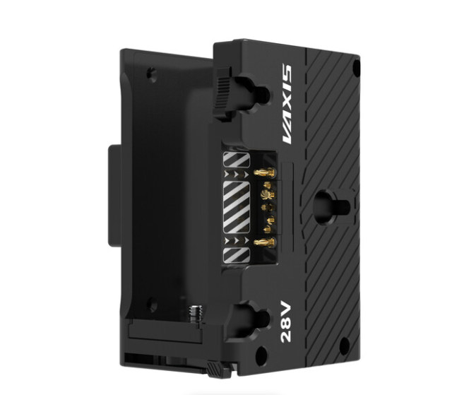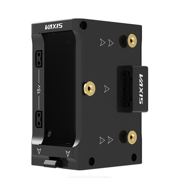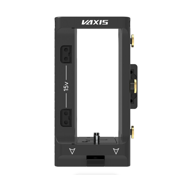 The Vaxis VS23-TX-AB Dual-Voltage Wireless TX Cradle features two D-Tap ports supporting both 14.4V and 28V power inputs, a quick-release plate compatible with Vaxis, Teradek, and other transmitters, and versatile mounting options including Gold Mount battery plates, providing a secure and flexible power and mounting solution for wireless video transmission systems.