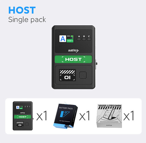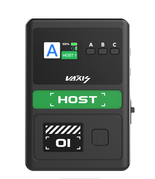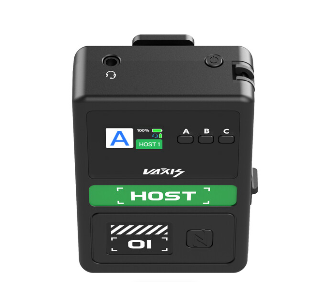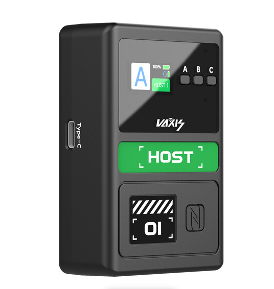 The Vaxis Litecomm V1 Host Controller is a full-duplex wireless intercom hub for the Litecomm V1 system, offering 1148' (350m) line-of-sight range using 1.9GHz DECT, NFC quick pairing with the host, Bluetooth 5.1 connectivity to the Air Headset (sold separately), dual-mic DSP noise reduction, USB-C charging/audio, 3.5mm output, and up to 8 hours of runtime on the included 1720mAh removable battery, with simple operation ideal for production teams.