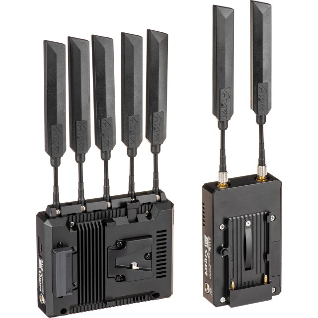 The Vaxis Storm 2000 HDMI/SDI wireless transmission system can transmit uncompressed 1080p60 video with near zero latency, and in the 5 GHz range. Included are seven antennas, two on the transmitter and five on the receiver, helping to transmit to a range approx. 600 m (line of sight). The transmitter supports multicast, allowing it to transmit a single video signal to multiple receivers, including other Vaxis models such as the Storm 058, 800, 1000S, and 5000. Each unit can be powered using its 2-pin LEMO type connector with a separately available cable and an AC or DC source. The receiver can also be powered by a V-Mount battery plate, available separately.