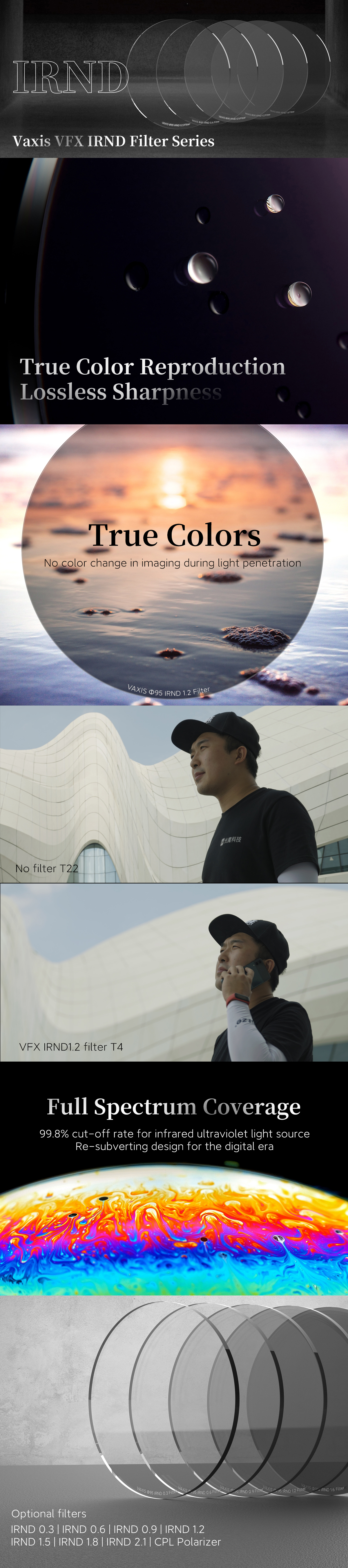 Vaxis VFX IRND Filter 95mm 1.5. True color reproduction, lossless sharpness. True colors. No color change in imaging during light penetration. Full spectrum coverage. 99,8% cut-off rate for infrared ultraviolet light source. Re-subverting design for digital era.