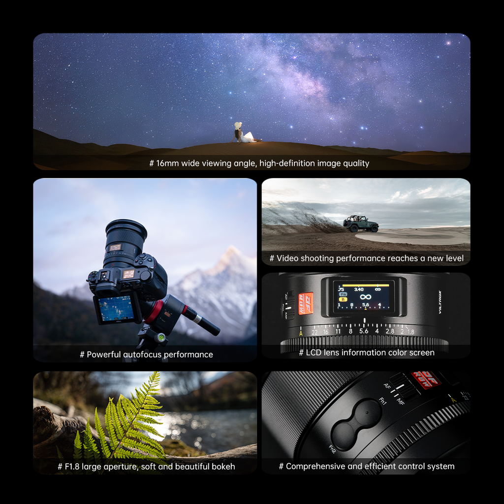 AF 16mm F1.8 Z has the unique advantages of Landscape/Astrophotography, full-frame high-definition and high-quality images. 3 aspherical lenses to accurately reproduce point light sources, and effectively suppress coma.