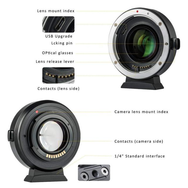 In addition to mechanically adapting Canon EF lenses to the EF-M mount (M system), it also reduces the focal length (x 0.71) and increases the aperture by about 1 aperture number. Electronic contacts mediate autofocus and aperture commands, as well as EXIF metadata; a USB port is used to upgrade FW. The underside of the adapter hosts a 1/4" thread for mounting elements/stat.