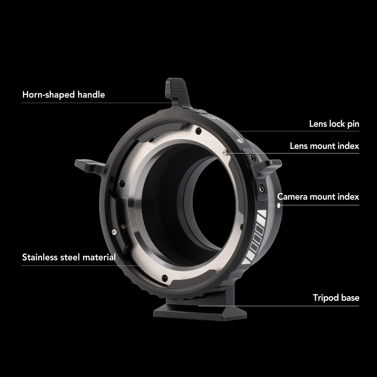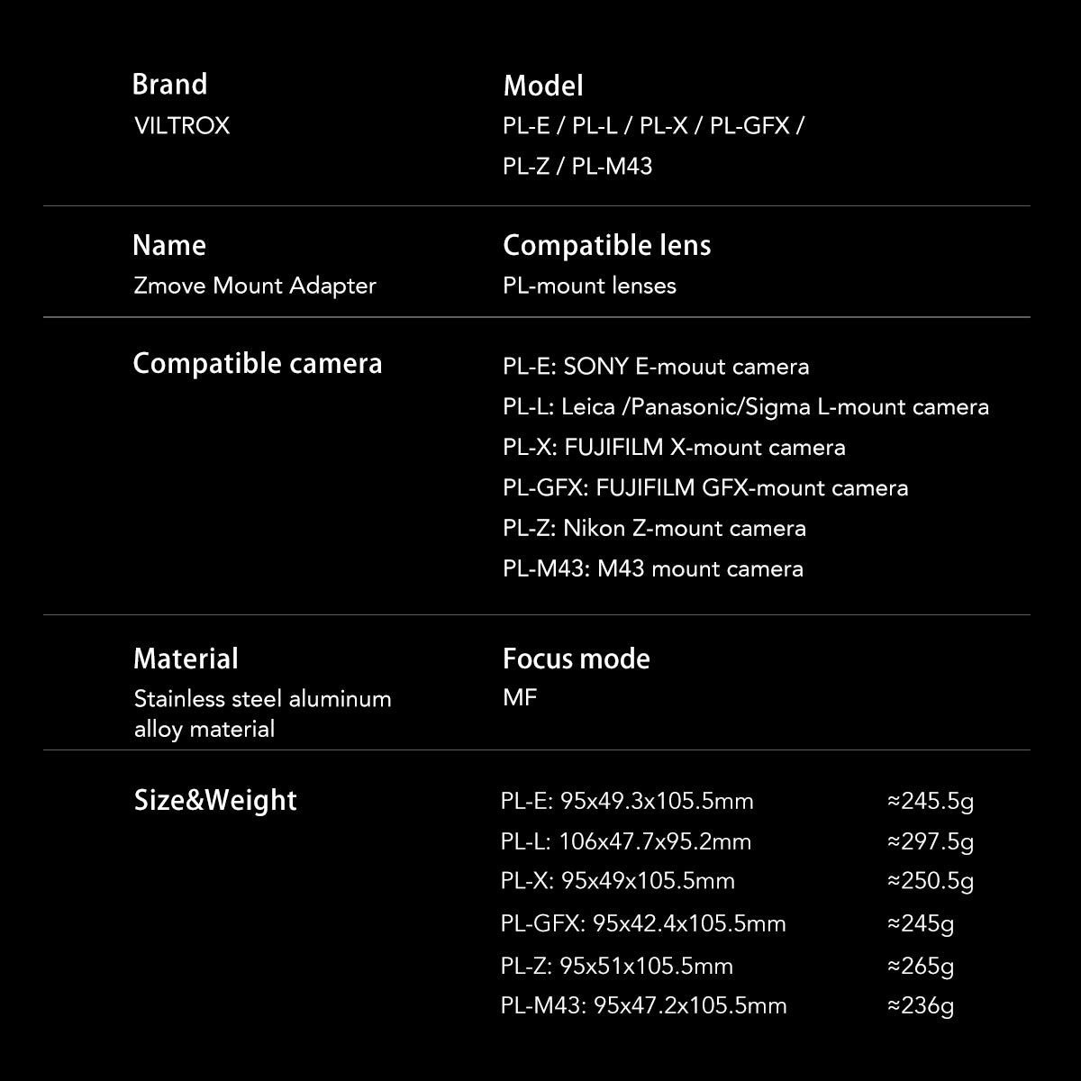 VILTROX ZMOVE PL SERIES MOUNT ADAPTERS CAN TRANSFER THE PL MOUNT SERIES LENSES TO THE L/E/Z/X/GFX/M43/R MOUNT CAMERAS, WHICH ARE NOT ONLY USED TO EXPAND THE RANGE OF EQUIPMENT MATCHING FOR THE VILTROX EPLC ANAMORPHIC LENSES, BUT ALSO COMPATIBLE WITH MORE PL MOUNT LENSES TO REALIZE THE MATCHING BETWEEN MORE LENSES AND L/E/Z/X/GFX/M43/R MOUNT EQUIPMENT.