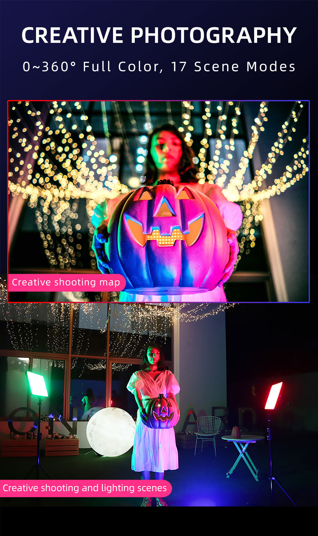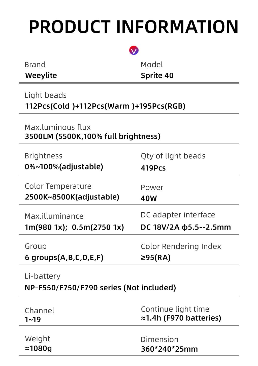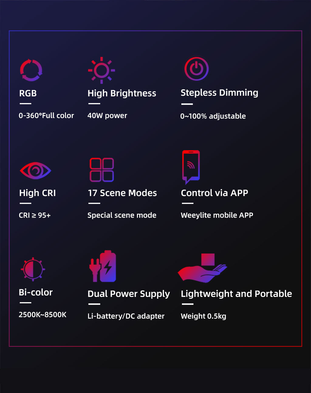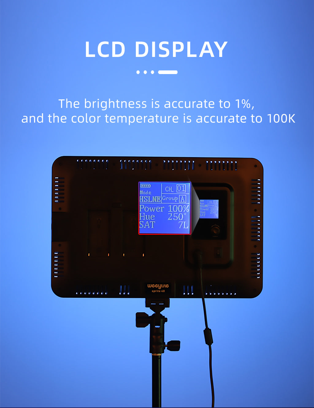 Sprite 40 is a professional photography RGB light which selected high index(white+warm) lamp beads and high quality RGB colored lamp beads.The color temperature and brightness can be adjusted easily.With the features of low power consumption,stable color temperature and easy to carry make it suit for your more shooting requirements.