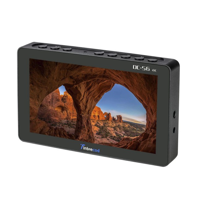Compact (147x90x21 mm, ~444 g) 5.5" camera monitor DC-56 offers an IPS touchscreen display with 1920x1080 resolution, 500 cd/m2 brightness, 160° viewing angles and 1200:1 contrast ratio, as well as an integrated 3500mAh battery with a battery life of about 3-4 hours and HDMI I/O. It comes with a power supply/charger, Mini HDMI cable, flash socket/arm reducer and cloth bag.
