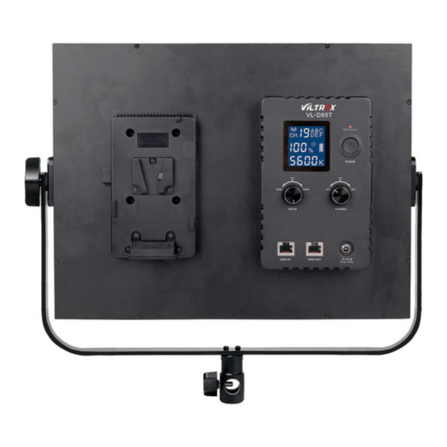 Color temperature and brightness may be controlled locally on the rear of the VL-D85T using the intuitive controls and LCD screen or by using the included 2.4 GHz wireless remote control. The wireless remote has a range of up to 65 feet and can control multiple lights in 19 groups and 6 channels. In addition, the RJ45 DMX in/out ports allow panels to be operated via DMX network connectivity.