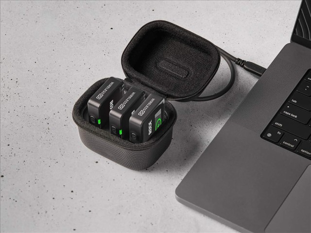 Thanks to the integrated battery, your wireless set can also recharge at the same time. It allows up to two full charges of the three-element set, so your Wireless Go three-element set can work for up to 21 hours. With the USB-C connection, you also have access to the entire system's data for transferring recordings, adjusting settings, and updating the wireless set's firmware.