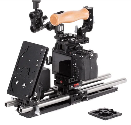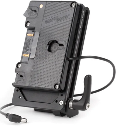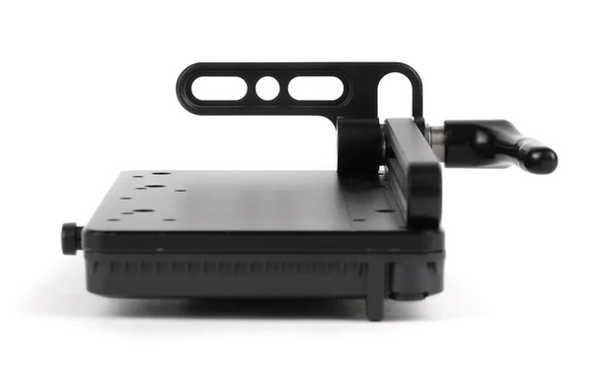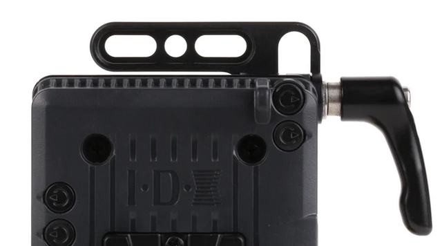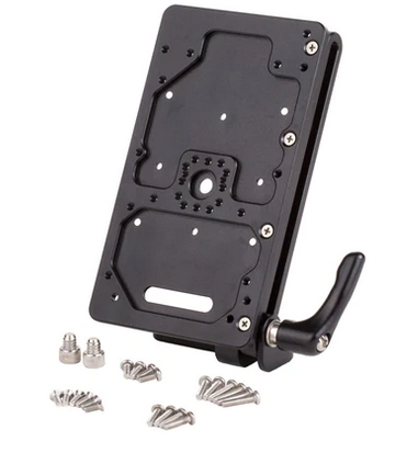 Battery Slide is an adjustable mounting system for WC V-Mount, WC Gold Mount, QRC Gold Mount, and RED®/Blueshape style battery plates. Rows of pass through holes allow attachment of Rod Clamps, cheeseplates, and more. Apply firm pressure to tilt the plate in place. Loosen the thumbscrew to slide the plate up and down and also tilt. Great for adjusting counterbalance and for transitioning from studio to handheld mode.