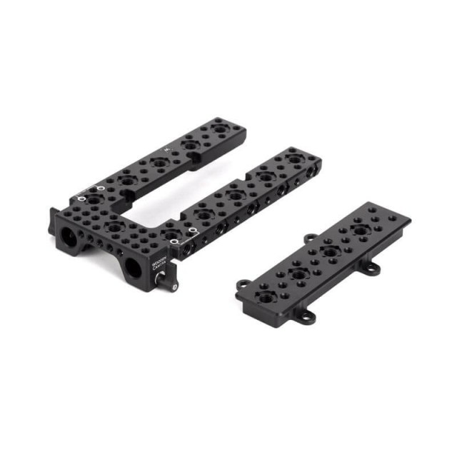 Top Plate (Sony FX9) is a top cheeseplate for the Sony FX9 that contours to the shape of the camera body. Arrays of 1/4-20 holes in standard spacing and multiple 3/8-16 holes with ARRI accessory mounts are also available in several places. Original Sony handle can be reinstalled by removing the center section of the top plate. Communication between the handle and the Sony body is possible by using just the U shaped portion of the top plate. The Sony XDCA-FX9 Extension Unit can also be attached to the rear of the camera without obstruction. 273 g.