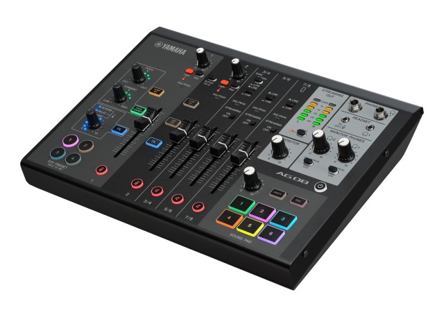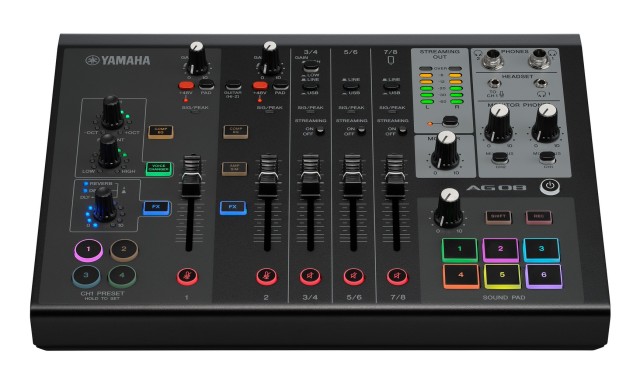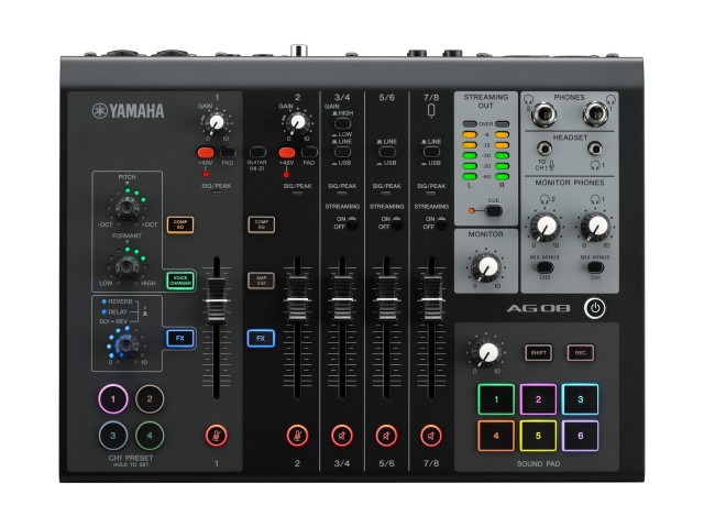 The AG08 is an 8-channel live streaming mixer featuring two phantom power inputs for condenser mics, an integrated USB audio interface, voice changer and sampler.