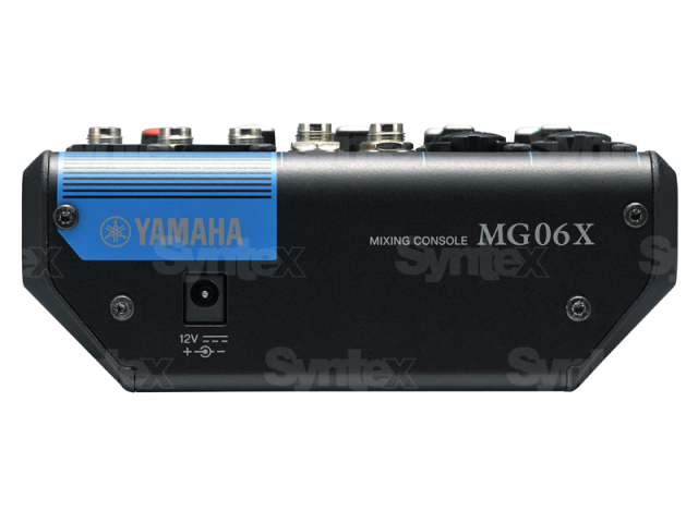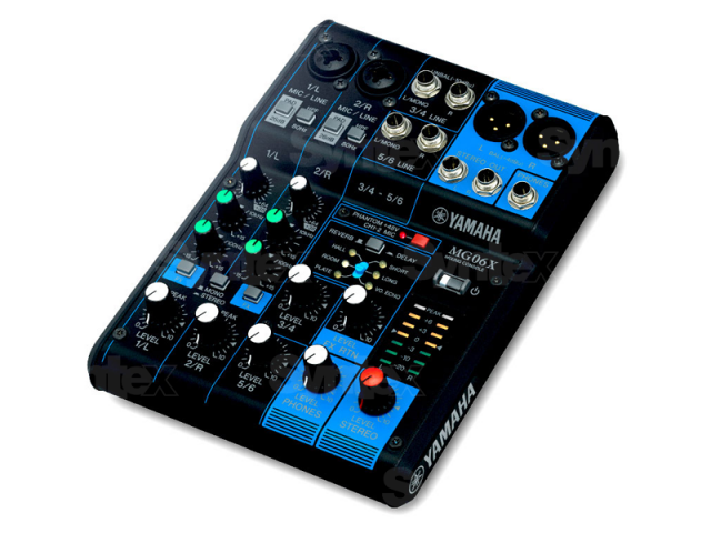 The MG06X from Yamaha is a compact six-input mixer with built-in effects for small performances, lectures, recordings, and similar applications. The mixer features two XLR-1/4" combo mic/line inputs with D-PRE mic preamps as well as two 1/4" stereo line inputs with level controls.