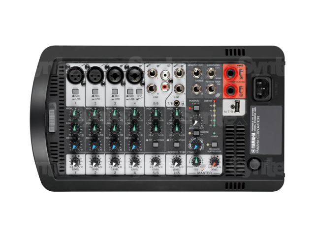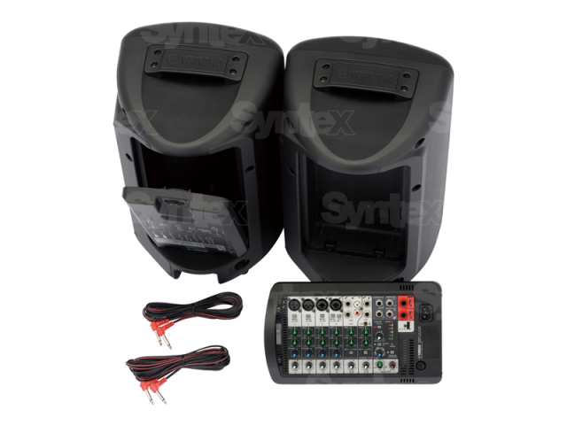 400-watt, portable PA system with 8-channel powered mixer, two 8" speakers, iPod/iPhone USB connection, SPX digital reverbs, an onboard feedback suppressor and versatile EQ.