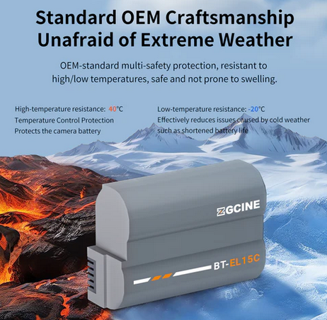 The ZGCINE BT-EL15C is a fully decoded 2400mAh (7.2V) high-capacity replacement battery for Nikon cameras that perfectly matches the original EN-EL15c in size and functionality – no warnings, full camera communication – while offering ultra-fast charging (full charge in ~2 hours with ZGCINE PS/PC chargers) and advanced 8-layer safety protection for reliable, extended shooting.
