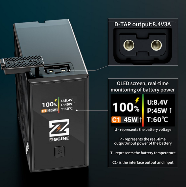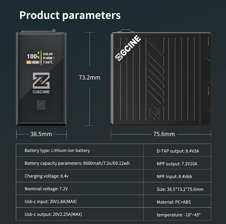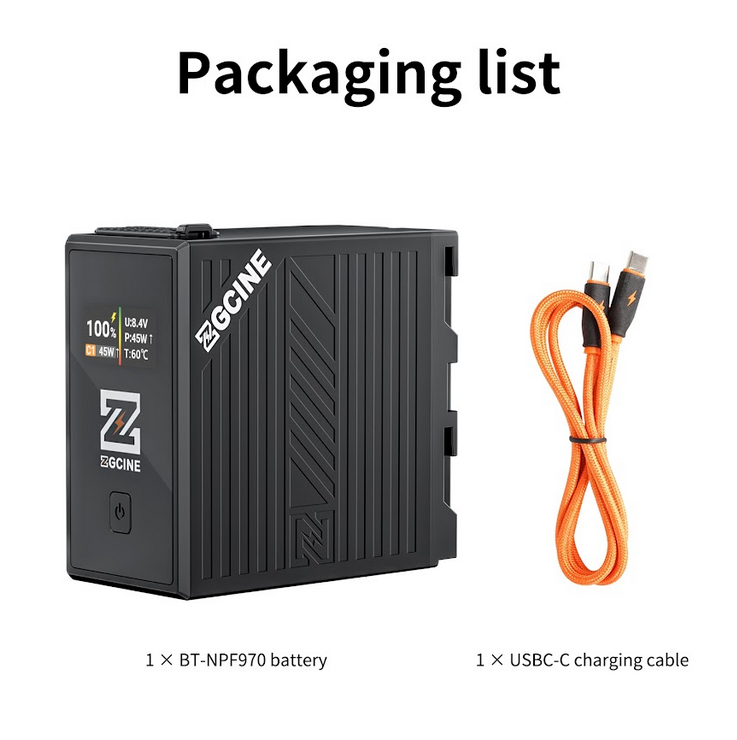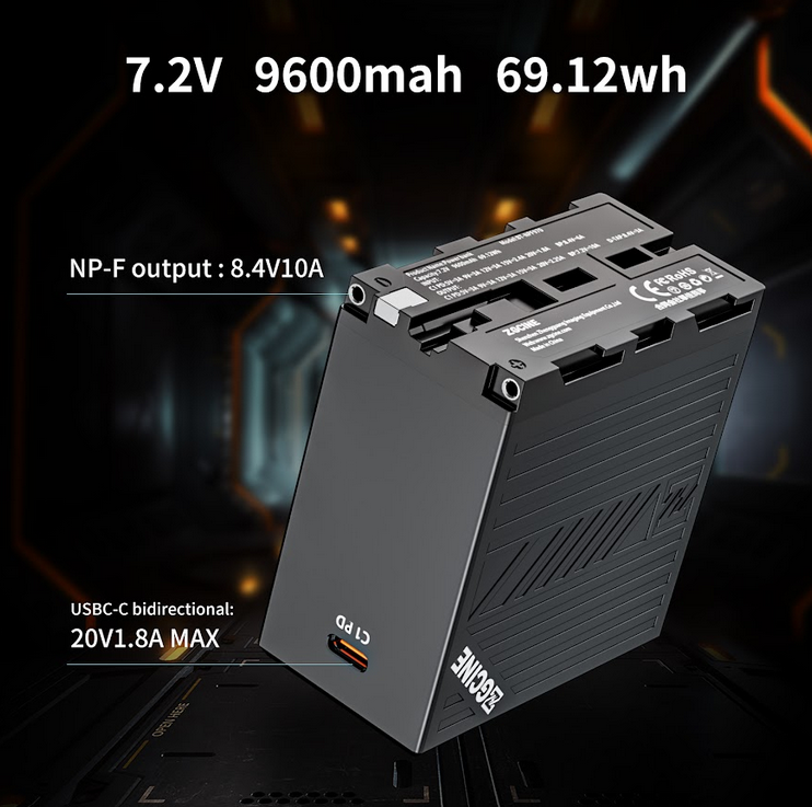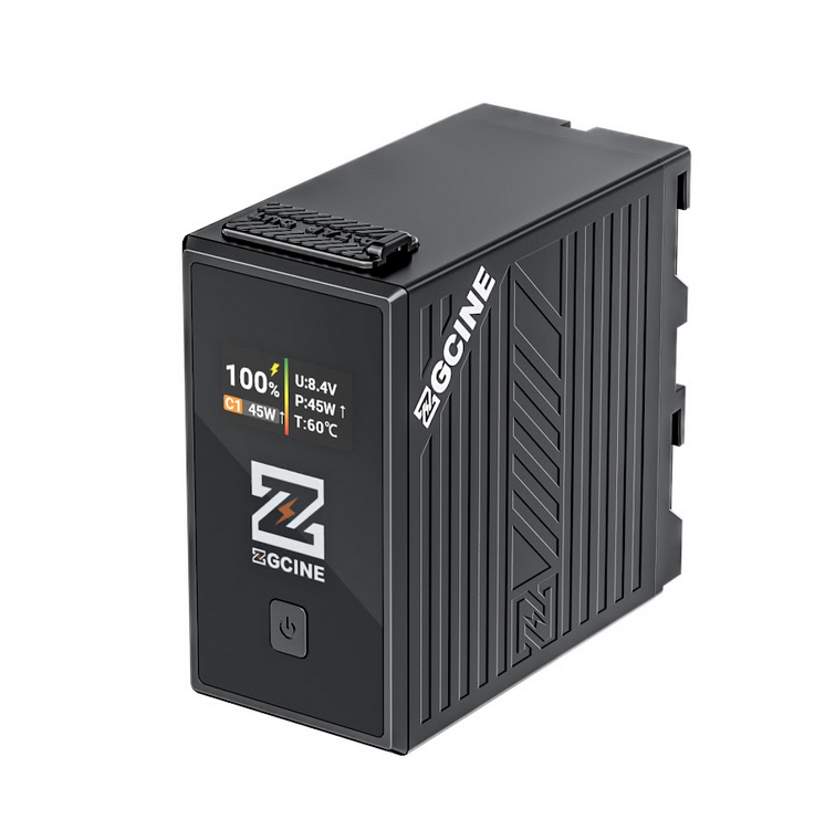The ZGCINE BT-NPF970 is a compact 9600mAh (69.12Wh) L-series lithium-ion battery with PD fast charging up to 36W, D-TAP (8.4V/3A) and NPF outputs, real-time OLED monitoring of voltage, power, and temperature, and comprehensive safety protections—ideal for powering professional video rigs, monitors, and lights.