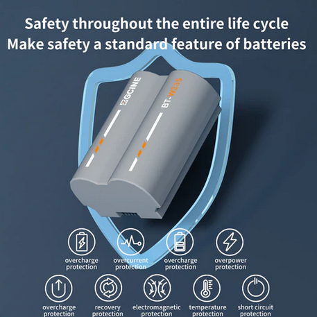 The ZGCINE BT-W235 is a professional-grade 2400mAh lithium-ion battery designed as a direct, drop-in replacement for Fujifilm’s NP-W235. Being fully decoded, it communicates seamlessly with the camera, accurately displays remaining power, and supports in-camera charging without pop-ups or restrictions. Constructed with premium Li-ion cells and an advanced 8-layer protection circuit (overcharge, overcurrent, short-circuit, overheating, etc.), it ensures stable output and enhanced safety. When used with ZGCINE PS series charging cases or PC series chargers, it supports ultra-fast charging and reaches 100% capacity in approximately 2 hours – much faster than standard charging methods.
