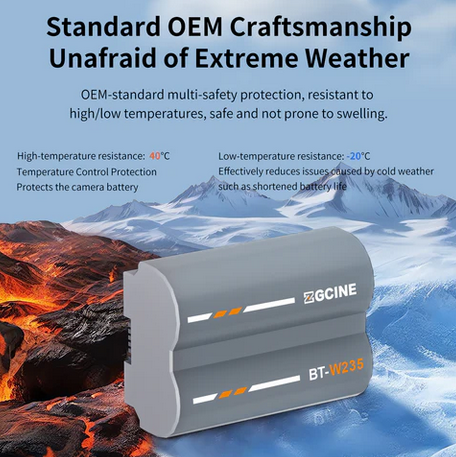 The ZGCINE BT-W235 is a fully decoded 2400mAh (7.4V) third-party replacement battery for Fujifilm cameras that matches the original NP-W235 in size and performance – no warnings, full camera communication – while offering fast charging (full charge in ~2 hours with ZGCINE PS/PC chargers) and robust 8-layer safety protection…