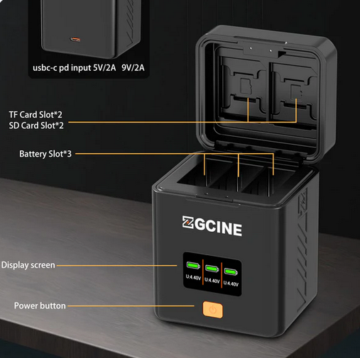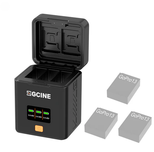 The ZGCINE Charging Case for GoPro 13 is a multi-functional accessory designed to charge up to three GoPro 13 batteries simultaneously. It features an integrated memory card storage system with slots for two SD and two TF cards, as well as a 0.96-inch OLED screen to monitor charging status, making it an all-in-one portable power and media storage solution.
