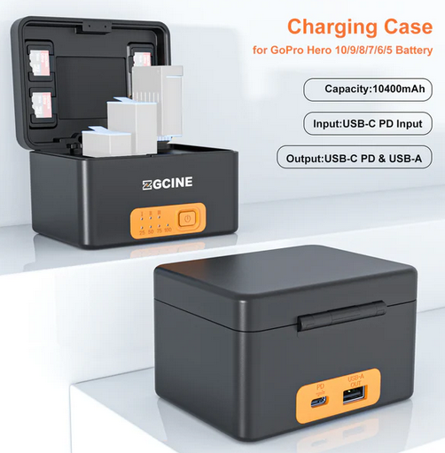 The ZGCINE GoPro Battery Charging Case (3-Bit, No Battery) is a compact and efficient charger designed for GoPro batteries, featuring USB-C PD fast charging, multiple output ports, and support for GoPro 11/10/9/8/7/6/5 batteries.