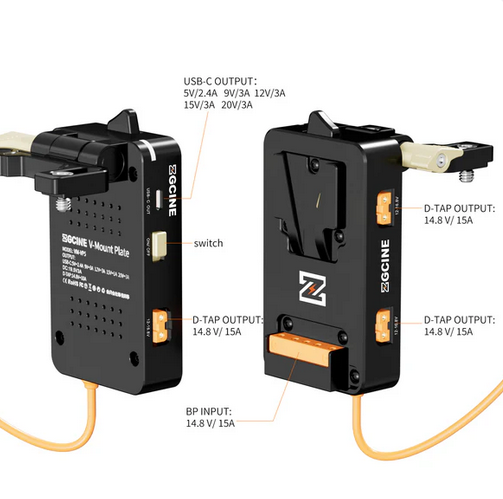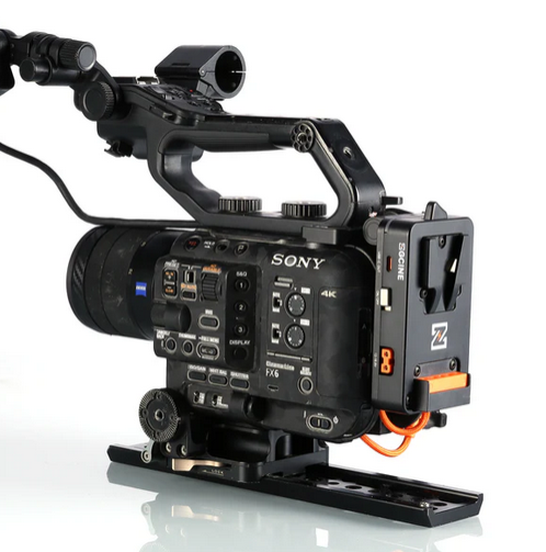 The VM-VP5 is a V-Mount battery plate with a regulated 19.5V output specifically for the Sony FX6 camera. It supports BPU built-in battery hot-swapping and provides a variety of power outputs, including USB-C PD and D-Tap. This plate allows for extended power and seamless battery changes during professional shoots.