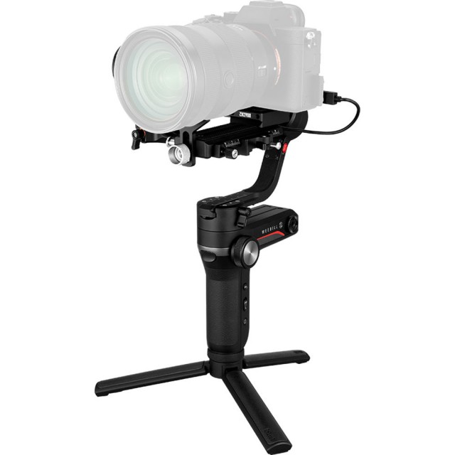 The WEEBILL-S comes with multiple accessories, including an Arca Swiss/Manfrotto dual-layer quick release plate and a storage case. Also included is a mini tripod that can be used as a stand or an extension handle. The mini tripod is also what completes the gimbal for underslung, low-mode operation. It attaches to the rear handle to function as an overhead handle.