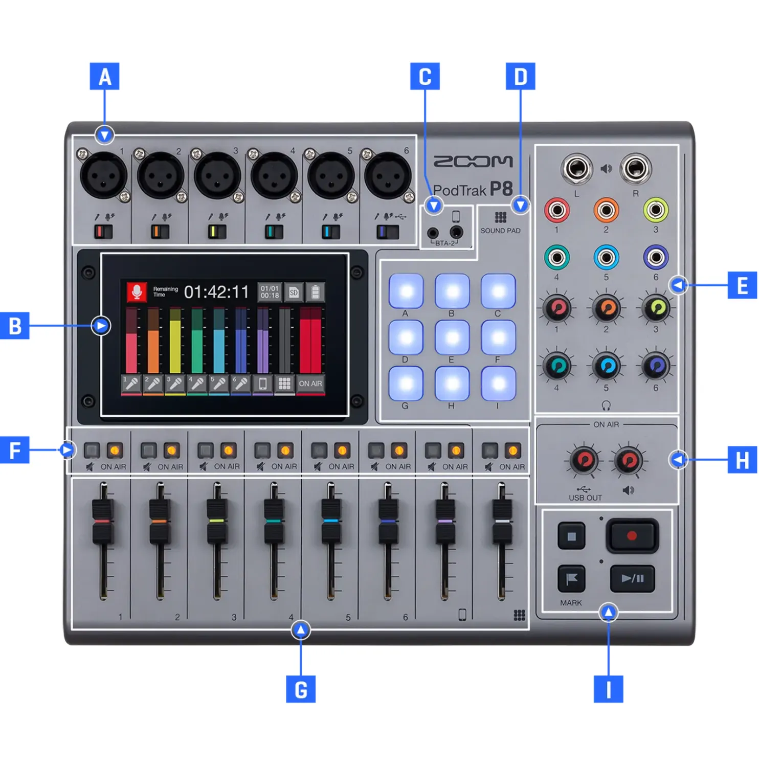 ZOOM PODTRACK P8 PODCAST RECORDER. Zoom PodTrak P8 is easy to use and can handle even the most ambitious podcasts. As a complete podcast studio, PodTrak P8 offers all the necessary features for recording, editing and mixing. The color touchscreen user interface allows quick access to monitoring, setup and integrated editing functions. All functions can be activated at the touch of a button.