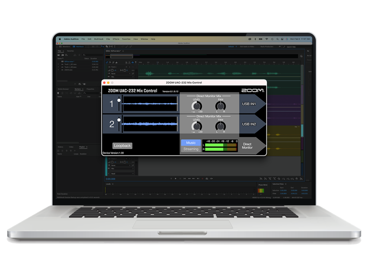 The UAC-232 Mix Control software allows you to adjust I/O routing, activate loopback, and control input and monitoring levels. You can also activate Music mode for routing to your DAW or Streaming mode, which combines all inputs into a single signal for streaming software.
